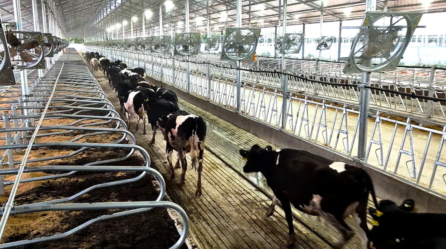 在37度高溫下,走進(jìn)智慧牧場(chǎng),猛然感到一陣涼爽,只見(jiàn)一排排可自動(dòng)調(diào)節(jié)轉(zhuǎn)速的風(fēng)扇正在“賣(mài)力工作”,一排排嶄新的淋浴器這在往吃草的奶牛身上均勻噴水。不一會(huì),吃飽喝足的奶牛開(kāi)始躺到舒適的臥床上“打盹”,臥床通道里不見(jiàn)糞污堆積,空氣中彌漫著奶牛飼料的清香。